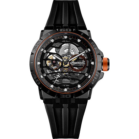 Ingersoll herenhorloge, roestvrij staal, skeletwijzerplaat met zwarte rand toont het uurwerk.