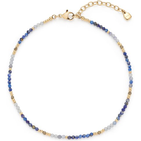 Leonardo halsketting van goudkleurig roestvrij staal met kleine blauwe en gouden glasstenen en een ovale hanger.