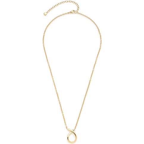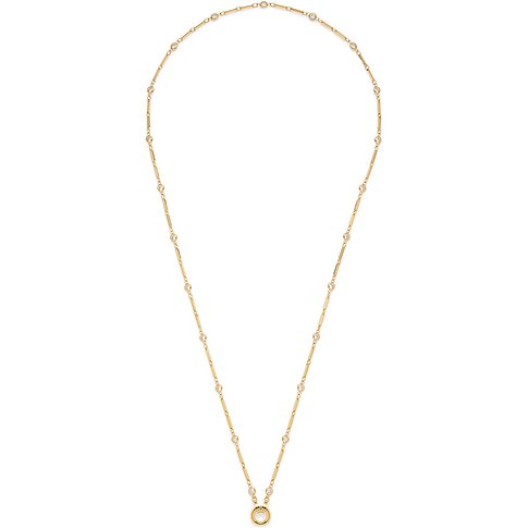 Een dunne goudkleurige Leonardo roestvrijstalen halsketting met een ronde hanger, bezet met zirkonia, op witte achtergrond.